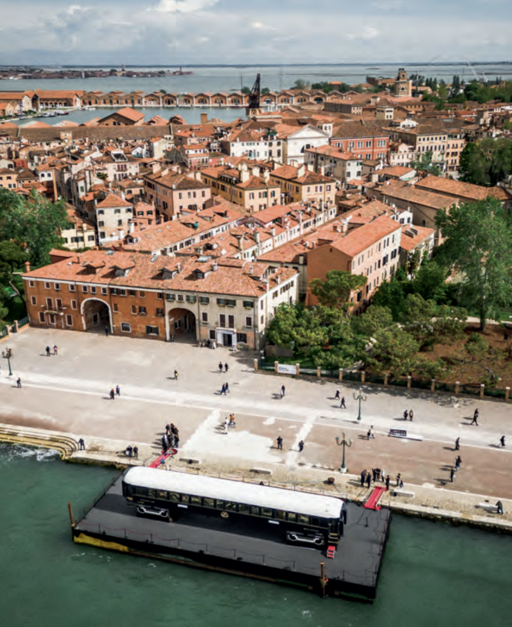 Dans le cadre de la Biennale de Venise 2024, une exposition flottante inédite en son genre offrait l’image surréaliste d’une luxueuse voiture du Venise Simplon-Orient-Express juchée sur une péniche naviguant sur un canal vénitien. Baptisée l’Observatoire, elle a été présentée du 17 au 22 avril au public qui pouvait regarder à travers les lucarnes en forme d’oculus pour découvrir la décoration signée par l’artiste français JR.